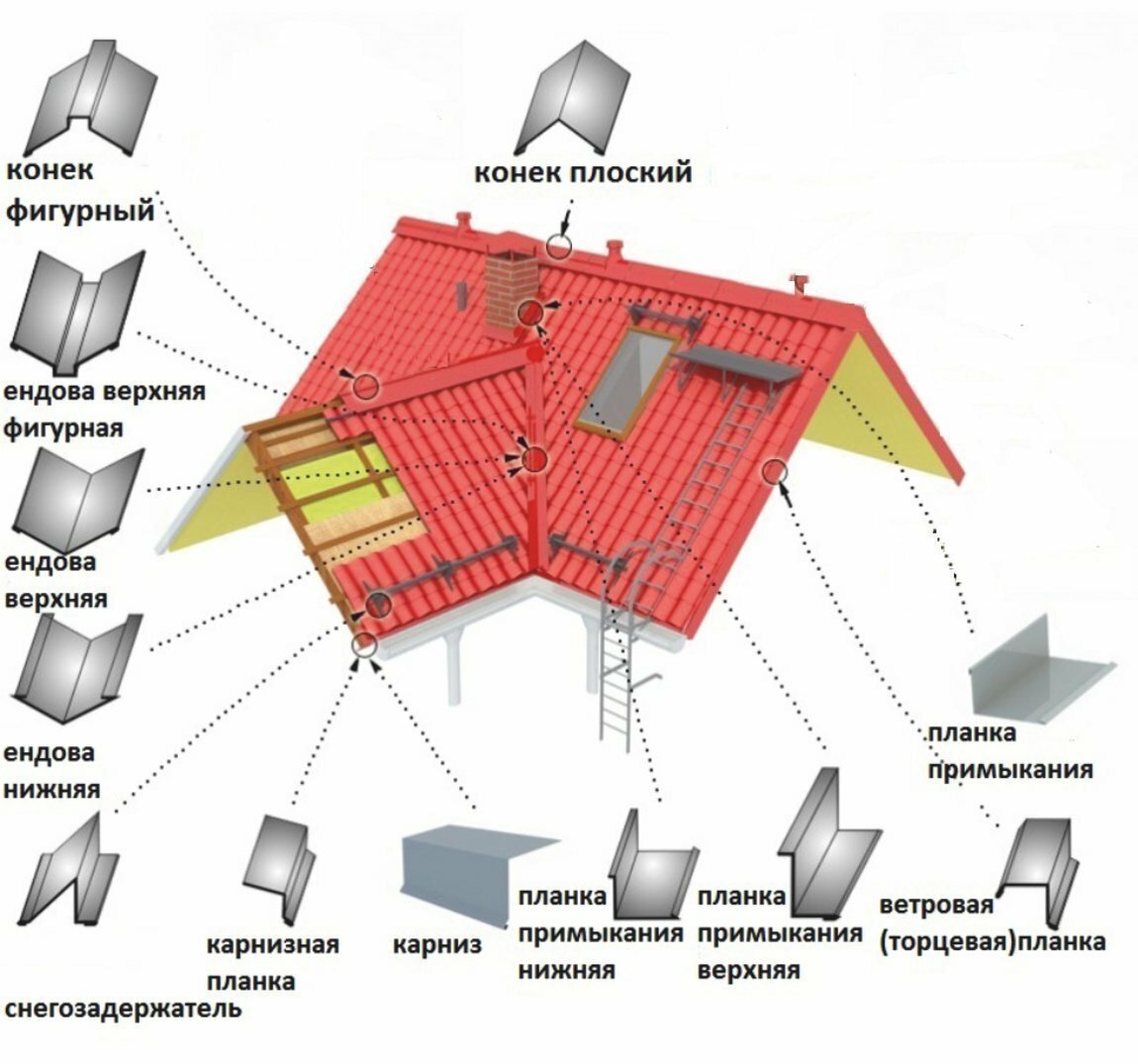 Доборные кровельные элементы можно приобрести или заказать следующих цветов: Коричневый (RAL 8017), Вишнёвый (RAL 3005), Зелёный (RAL 6005)Графитовый (RAL 7024), Оцинкованный